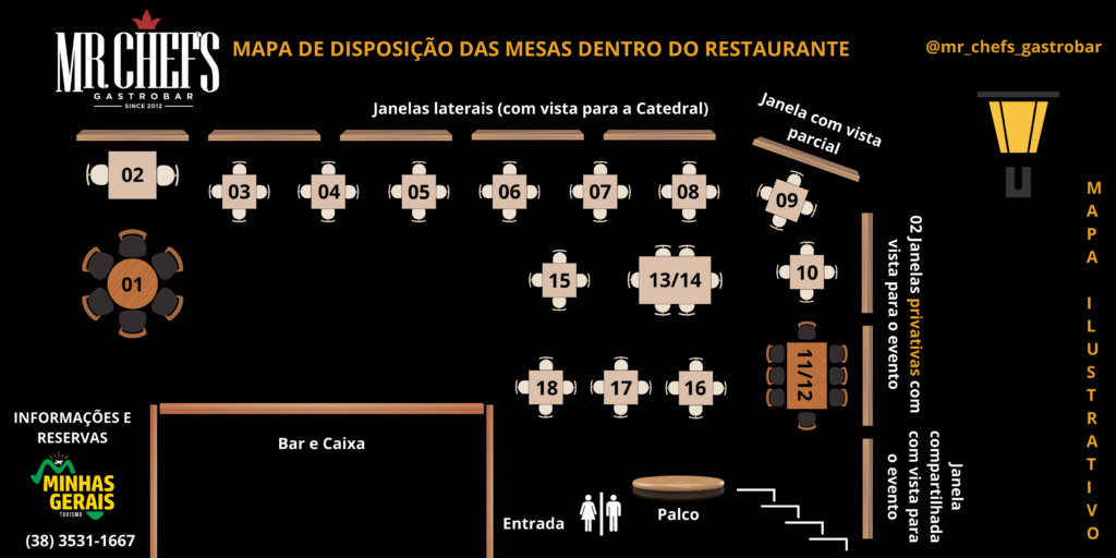 O Mr Chef’s Gastrobar é um estabelecimento renomado em Diamantina, localizado na Praça Correa Rabelo, 119B, no centro histórico da cidade. Situado no segundo andar de um casarão histórico, o gastrobar oferece uma vista privilegiada da Catedral de Santo Antônio e da icônica Rua da Quitanda, proporcionando aos clientes uma imersão na rica história e arquitetura local.